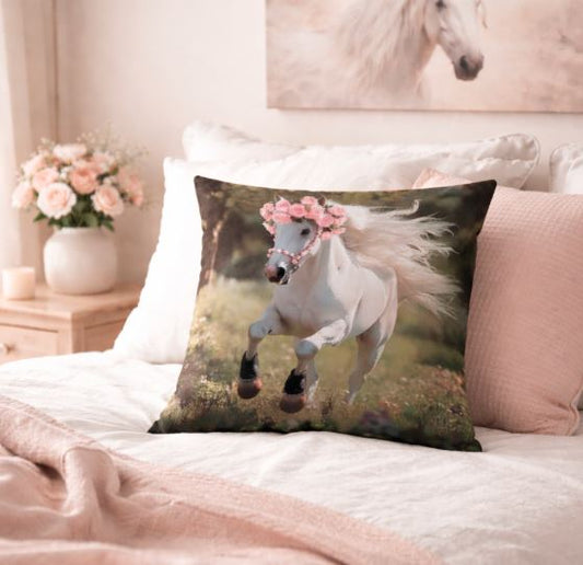 Kussenhoes Wit Paard - Roze rozen - 45x45 cm